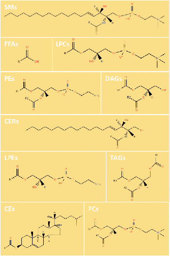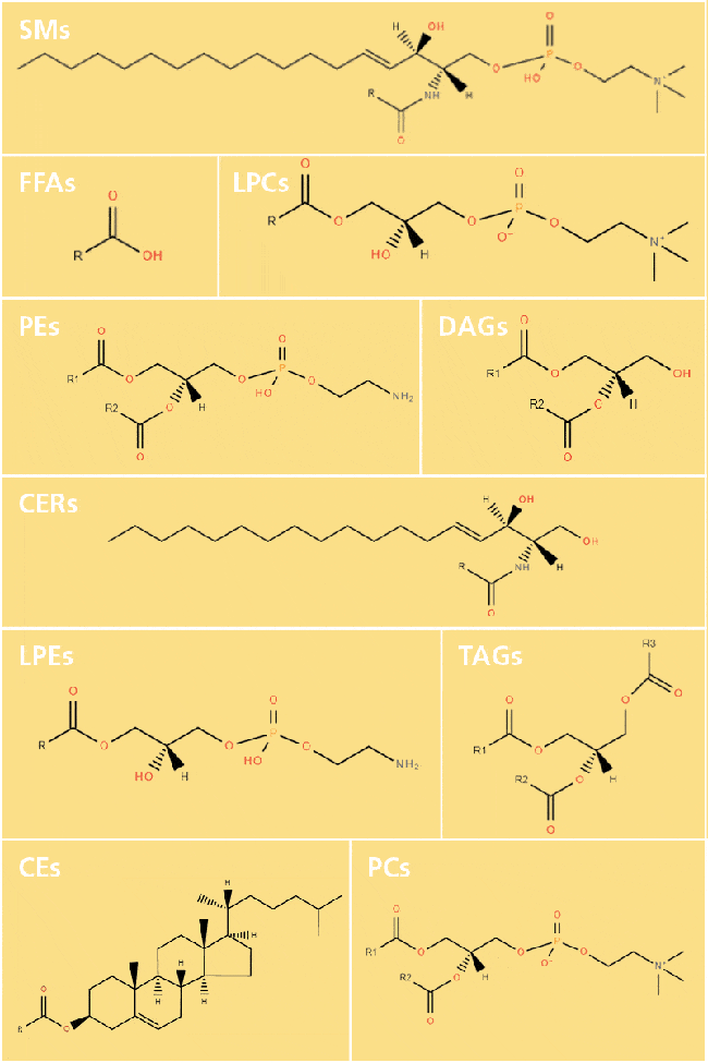Lipidyzer 플랫폼은 아래 표시된 지질종을 포함한 13종의 지질 클래스에서 1100종 이상의 지질종을 정량화하기 위해 설계되었습니다. 나열된 세라마이드에는 디히드로세라마이드(Dihydroceramidse, DCER), 헥소실세라마이드(Hexosylceramide, HCER) 및 락토실세라마이드(Lactosylceramide, LCER) 등 3종 클래스가 추가로 포함되어 있습니다.