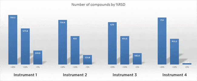 재현성이 높은 지질 데이터. 연구실 3곳의 장비 4대에서 플랫폼이 밸리데이션됩니다. 플랫폼을 통해 20% 미만의 CV로 대조군 시료 내에서 최대 700종의 분자종을 확실하게 측정할 수 있습니다.