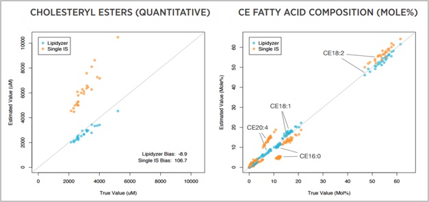 정량 바이어스가 없습니다. 사람 혈청 내 콜레스테롤에스테르 총 농도(CE 왼쪽)와 콜레스테롤에스테르의 지방산(FA) 조성(CE FA 오른쪽)을 정확하게 정량 분석하기 위한 단일 내부 표준물 사용과 Lipidyzer 플랫폼 내부 표준물을 비교했습니다. 시료는 총 CE와 프로파일링된 CE FA 조성이 확인된 사람 혈청 25개였습니다. 단일 내부 표준물 방식을 사용하는 경우, 플랫폼은 100% 바이어스와 비교 시 10% 바이어스 미만으로 총 CE를 정량화했습니다. 모든 클래스에서 이러한 패턴을 나타냈습니다.