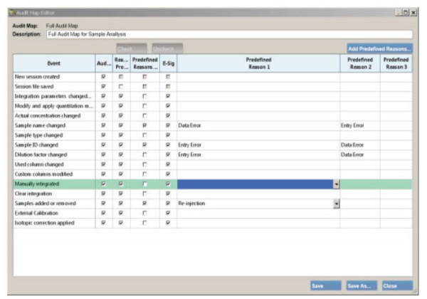 MultiQuant Software는 또한 완벽한 제어를 통해 감사 추적을 효과적이면서 효율적으로 관리합니다. 일례로 Audit Map Editor를 사용하여 사전 정의된 원인과 사용 가능한 전자 서명을 관리할 수 있습니다.