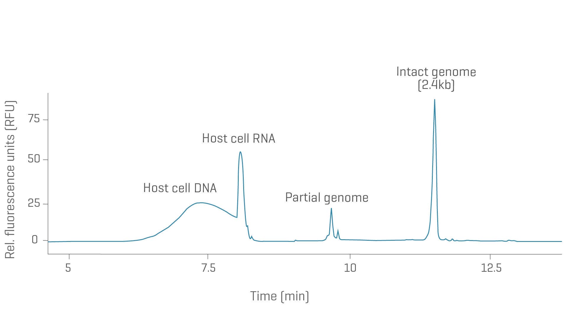 High-resolution genome integrity analysis of AAV8 with CGE and LIF detection. The intact genome of 2.4kb was well separated from potential partial genomes and host cell RNA and DNA impurities.