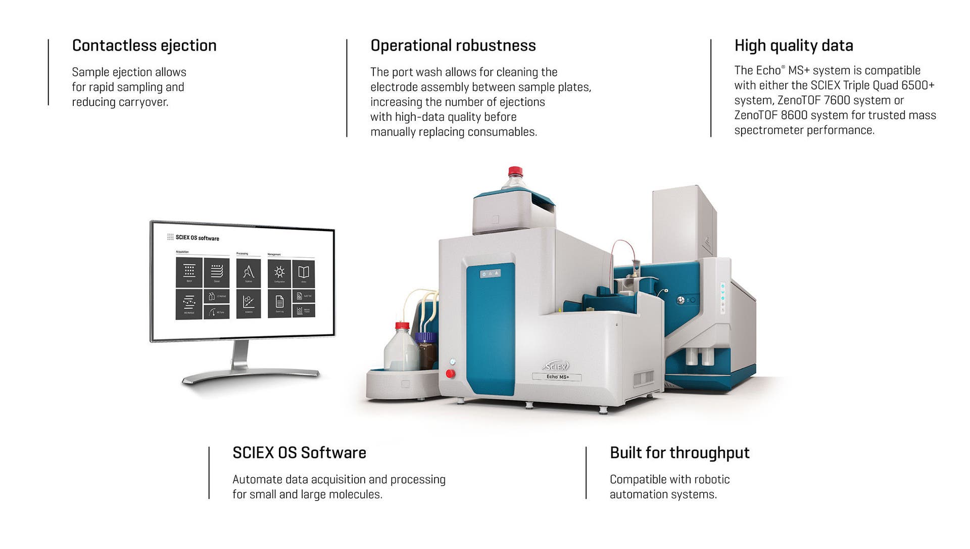 The Echo® MS+ system is compatible with either the SCIEX Triple Quad 6500+ system or the ZenoTOF 7600 system for trusted mass spectrometry performance.