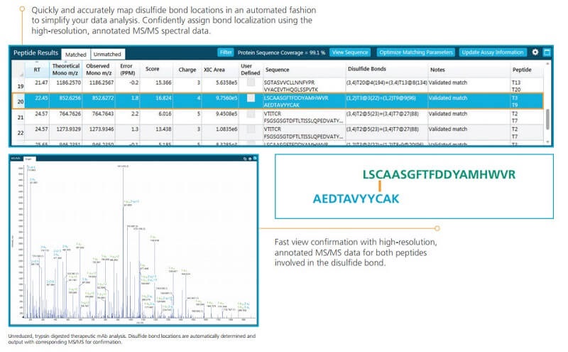 Let the software quickly and accurately map disulfide bond locations to simplify your data analysis. The built-in algorithms in BioPharmaView Software quickly: