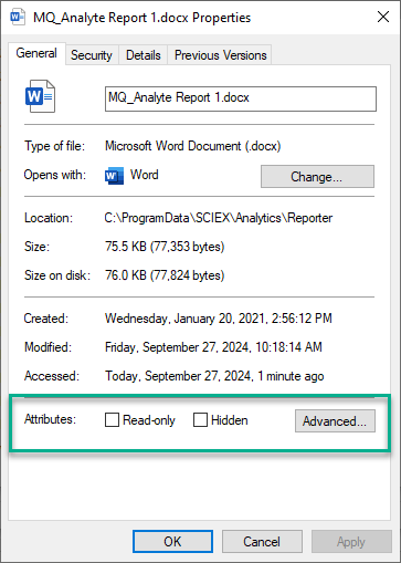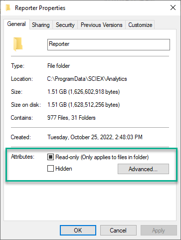 Therefore in <Properties> (right mouse click on the file or folder in Windows explorer) the attributes of the reporter folder and the templates should not be changed and should by default look like this: