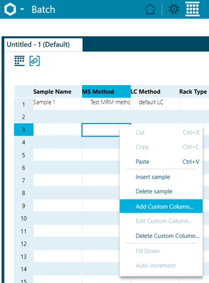 To add a custom column to a batch in SCIEX OS software, open an existing batch or make a new one. Right-click anywhere on the batch table area. Then, select the option Add Custom column…