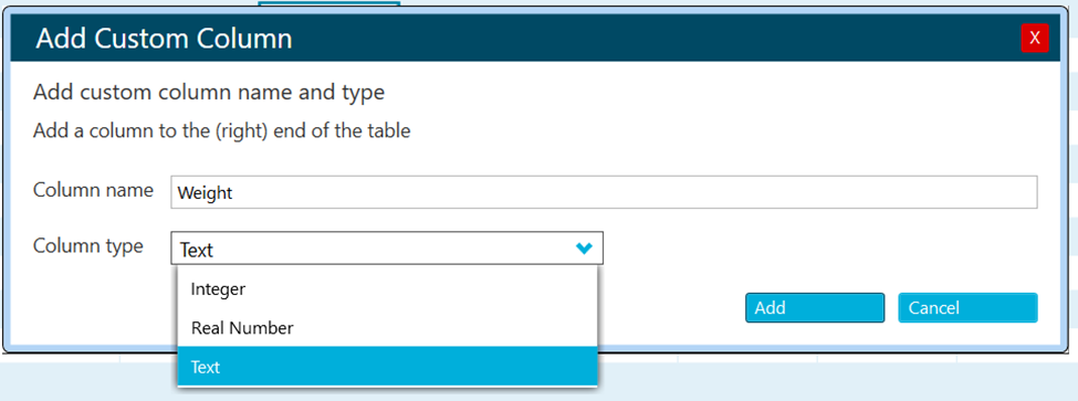 This will open a box where the name for the custom column and its type (text, integer, or real number) can be assigned.