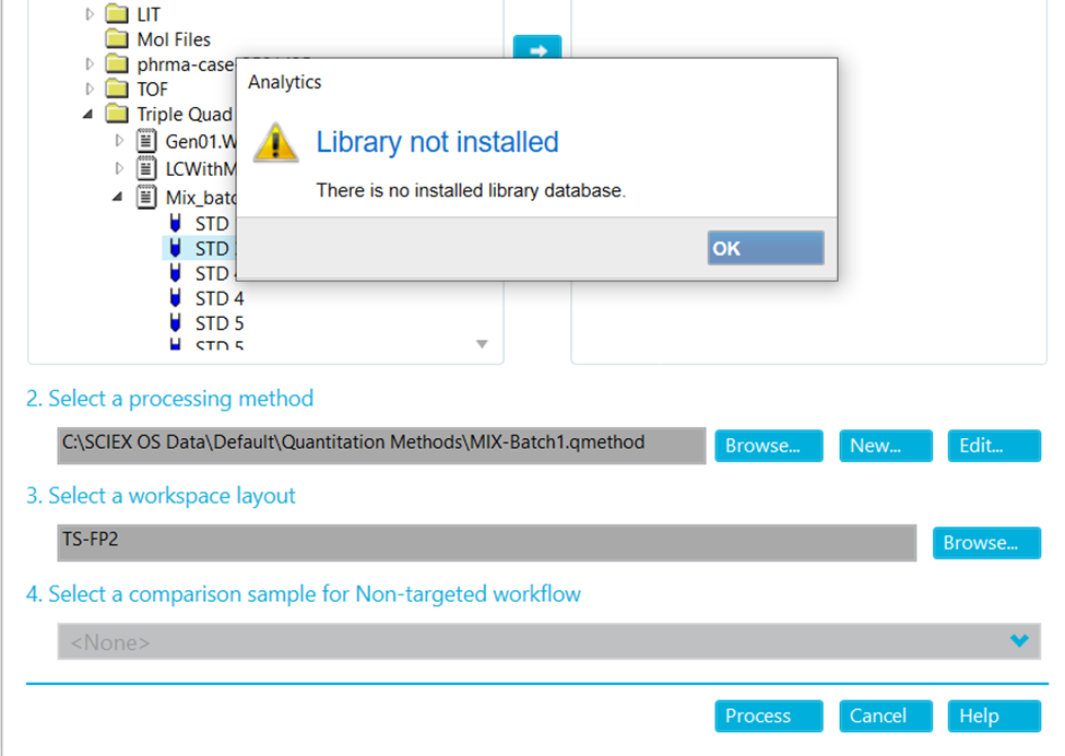 This knowledge article addresses the workflows where no library search is required, and the user wants to avoid this unnecessary error. If your workflow includes targeted analysis or non-targeted screening and a library is required, but it is not working, please contact SCIEX Tech Support for troubleshooting.