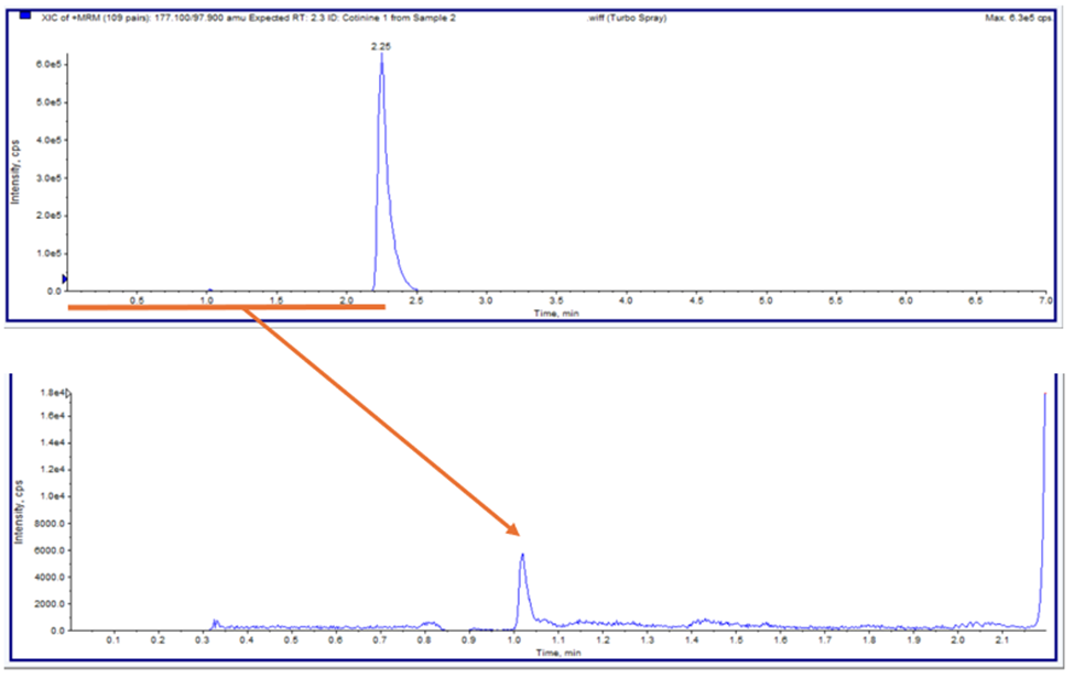This scenario is demonstrated below, where the real scan time is longer than the designated window (30 s) in the acquisition method. In this instance, the transition for cotinine 1 has the earliest RT and a longer scan window to cover the start of the experiment where no other analytes are being acquired. Note: The second panel below shows a magnification of cotinine's extracted ion chromatogram (XIC) from 0-2 min to show the extended baseline clearly. The 0-0.3 min time range is also scanned; however, intensity is almost equal to zero due to flow being diverted to waste by diverter valve.
