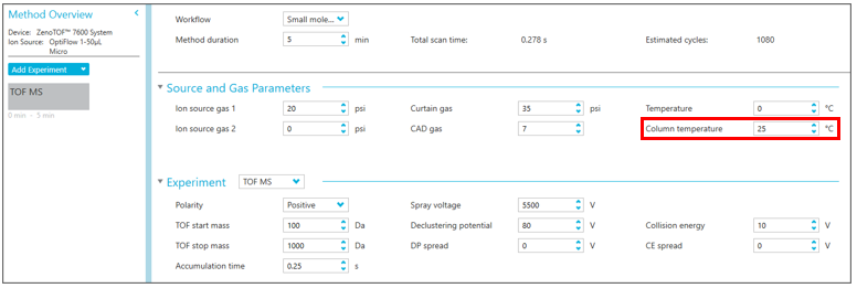 Typically, column temperature is set in the LC method. However, the OptiFlow® ion source has its column compartment directly above the probe on the source itself, so the column temperature field is located in the MS method and can only be adjusted there.