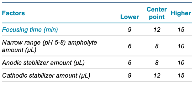 The response surface methodology (RSM) model was used for the optimization procedures. Four main factors that are known to have a significant impact on cIEF separations2 include focusing time, the amount of narrow range (pH 5-8) ampholytes added, the amount of anodic stabilizer added and the amount of cathodic stabilizer added. Preliminary experiments (data not shown) were used to determine the lower, higher and center points (Table 1).