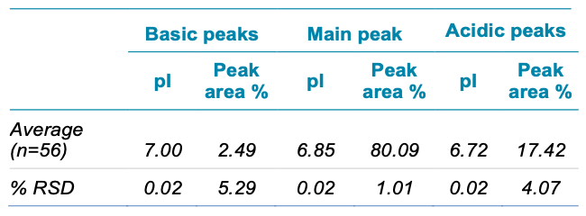- The optimized method is highly reproducible for pI and area % composition