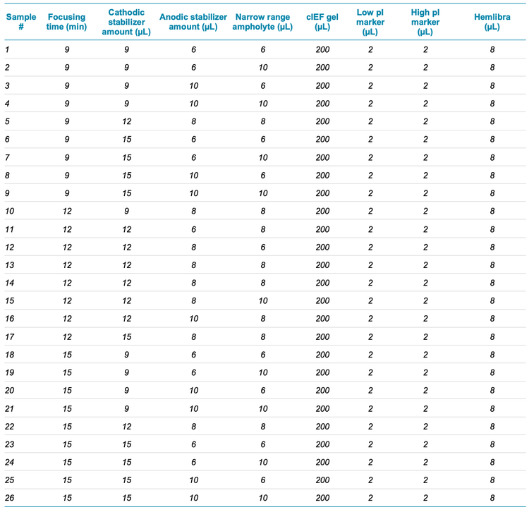 Sample preparation: The Hemlibra sample was diluted to 5 mg/mL with deionized water before DoE method optimization. The sample, all buffers and other reagents were prepared according to instructions in the Capillary Isoelectric Focusing (cIEF) kit for the BioPhase 8800 system application guide. 1 Each sample was mixed thoroughly at room temperature. After a brief spin, a 100 μL aliquot was transferred to each well of the sample plate.
