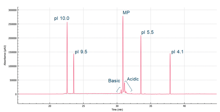 - Improved resolution: A resolution of 2-5 was achieved between the basic variant and the main peak and a resolution of 2-4 was achieved between the acidic variant and the main peak (Figure 1)