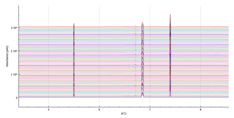 - High reproducibility: The BioPhase 8800 system provides excellent reproducibility (%RSD) for pI and peak area percentage composition at or below 0.02% and 3.4%, respectively