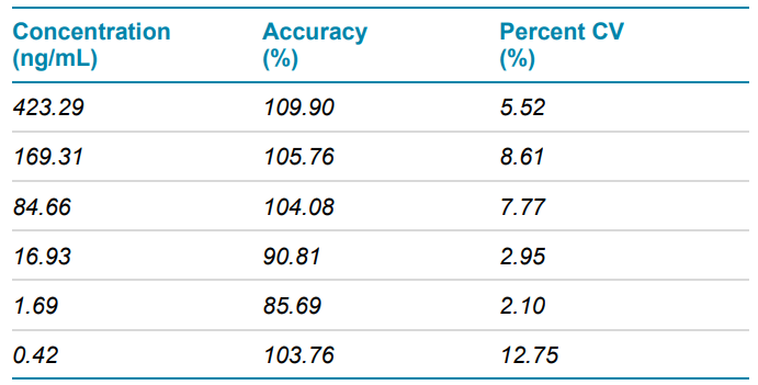 For Zeno SIM, the overall linear range covered 0.42 ng/mL to 423 ng/mL. A linear dynamic range (LDR) was confirmed to be three orders of magnitude (Figure 3).