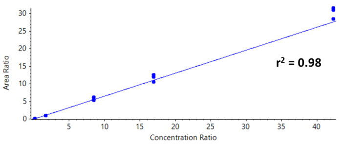 In this workflow, quantification of cyclic peptides was compared using Zeno SIM, Zeno CID and Zeno EAD. All calibration points were measured in triplicates. The LLOQ was determined based on the requirements that the %CV of the average of the concentration must be below 20% and the accuracy must be between 80% and 120%. For the concentrations above the LLOQ, the %CV of the mean of the calculated concentration was required to be below 15% and the accuracy was required to be between 85% and 115%.