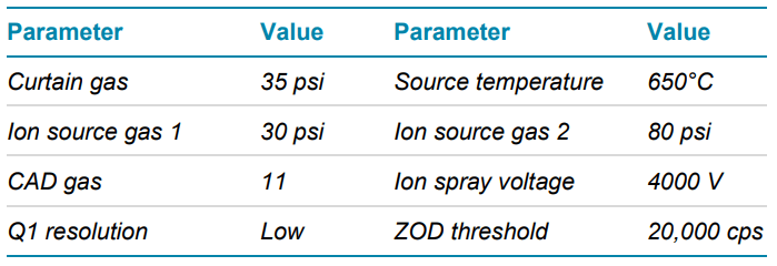 A summary of the source and MS parameters and the Zeno trap settings is displayed in Table 2.