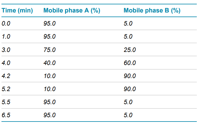 Chromatography: The separation was performed at a flow rate of 0.3 mL/min using an ExionLC system. A HALO BioClass Peptide ES-C18 column (2.1 x 50 mm, 2.7 µm, 160 Å) was used for separation. The column oven temperature was set to 40ºC. The mobile phase A consisted of 0.1% formic acid in water, while the mobile phase B was composed of 0.1% formic acid in acetonitrile. A volume of 20 µL was injected for analysis. Chromatographic conditions are summarized in Table 1.