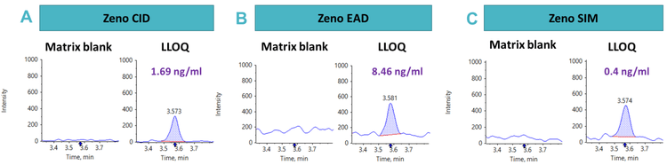 An LLOQ of 1.69 ng/mL, 8.46 ng/mL and 0.4 ng/mL was achieved using the Zeno CID, Zeno EAD and Zeno SIM modes, respectively (Figure 2). In this case, the best sensitivity was reached using Zeno SIM with up to a four-fold improvement in LLOQ compared with Zeno CID and a 21-fold improvement in LLOQ compared with Zeno EAD.