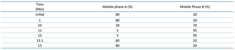 IP RPLC separation: Oligonucleotides were separated based on IR RPLC using a Phenomenex Biozen Oligo LC column (2.6 µm, 50 x 2.1 mm) installed on a Nexera XS inert HPLC system (Shimadzu). The separation was performed using the gradient shown in Table 1 with a column temperature of 60°C and flow rate of 0.4 mL/min. Mobile phases A and B are water and methanol/water (1:1 v/v), respectively, with 50 mM 1,1,3,3,3-hexafluoroisopropanol (HFIP, Sigma-Aldrich) and 15 mM diisopropylethylamine (DIPEA, Sigma-Aldrich).