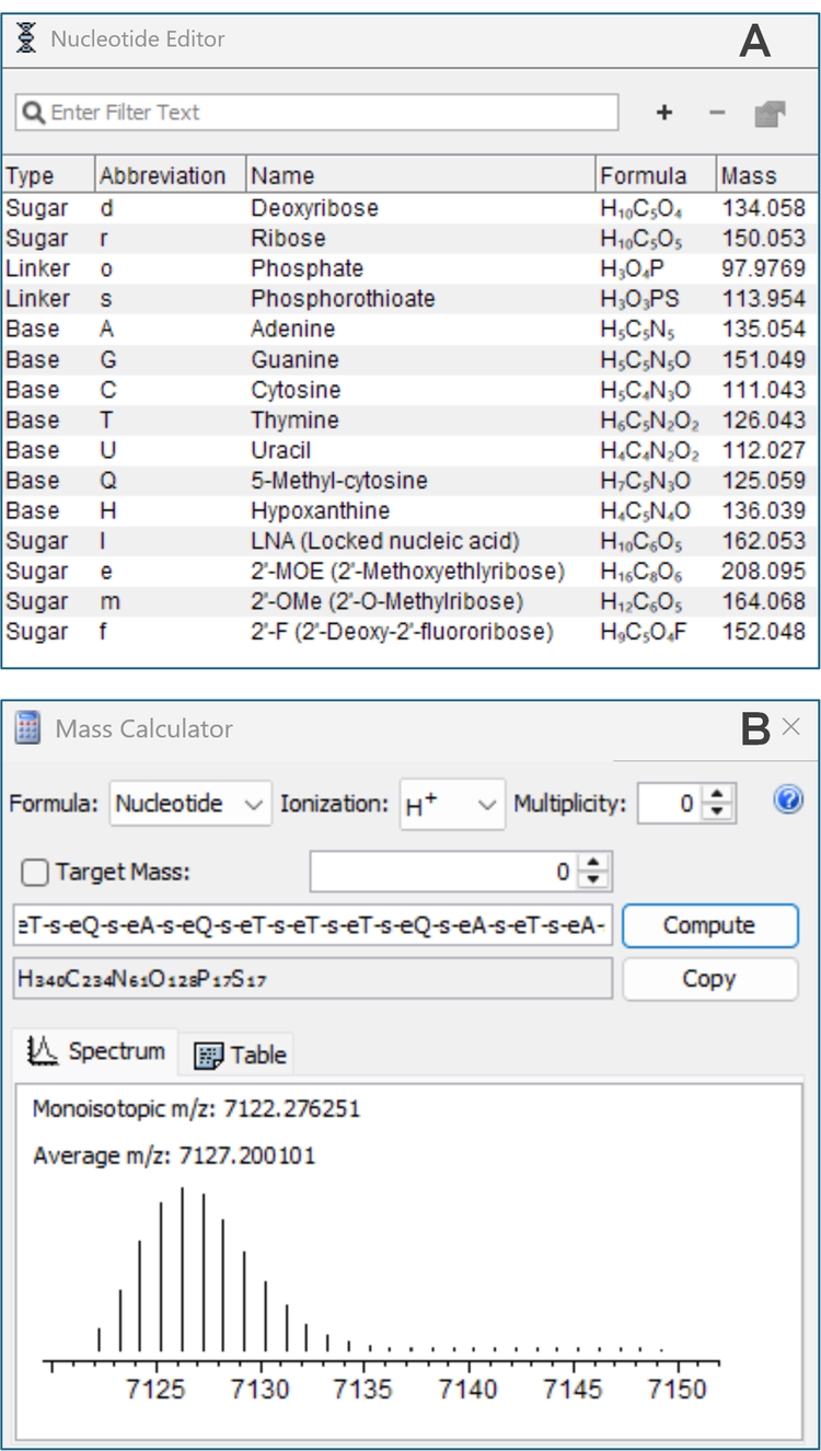 where the dash (“-“) symbols are optional. This sequence was entered into the Oligo node (Figures 2 and 3) for the generation of a candidate mass list for mass mapping. The oligonucleotide sequence can also be copied to the mass calculator for formula and mass calculation (Figure 4B).