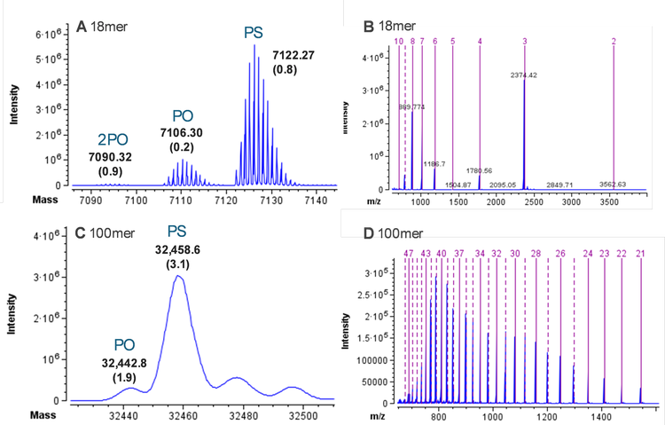 Intact oligonucleotide deconvolution and mass mapping were performed for the 18mer using the monoisotopic mass and for the 100mer using the average mass. Figure 6 shows the devolution results of 2 oligonucleotides. The ZenoTOF 8600 system offered high MS sensitivity for the detection of a low-abundant 2PO species with 2 desulfurization (PS®PO) in the 18mer (Figure 6A). A high mass accuracy (<5 ppm) was achieved for all the PS and PO species.
