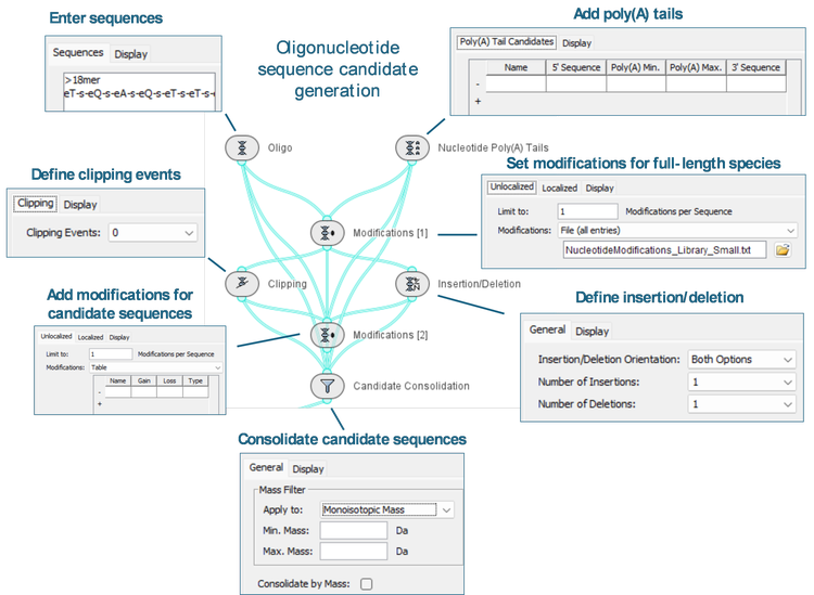 Figure 3. Oligonucleotide sequence candidate generation. Biologics Explorer software provides flexibility in creating oligonucleotide sequence candidates for mass mapping. The oligonucleotide sequence is defined based on the sugars, linkers or bases defined in the Nucleotide Editor (Figure 4), where users can also add custom entries. The poly(A) tails and insertion/deletion are specified in 2 separate activities, which may be disabled if they are not applicable. Up to 2 clipping events on the 3’ and/or 5’ ends can be set. The modifications can be defined for the sequence with or without the poly(A) tails (see “Modification [1]” activity) or for the variants resulting from clipping or insertion/deletion (see “Modification [2]” activity). The monoisotopic or average masses of all the candidate sequences are consolidated for mass mapping with the deconvolution results.