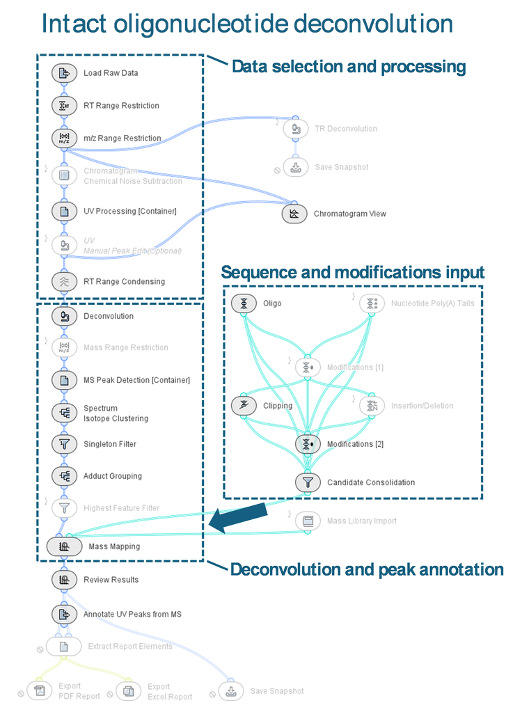 Figure 2 shows an overview of the intact oligonucleotide deconvolution workflow introduced in the Version 7.0.1 of Biologics Explorer software. Compared to the intact protein deconvolution workflow, this data analysis workflow includes a cluster of activities for creating oligonucleotide sequences and their sequence variants (Figure 3). Any of these activities can be enabled or disabled depending on the need and goal. This allows the flexibility and versatility in creating candidate sequences of an oligonucleotide and its variants with or without modifications. A consolidated list of monoisotopic or average masses from the Candidate Consolidation activity serves as the input for mass mapping with the deconvolution results for peak assignment and annotation (Figures 2 and 3).