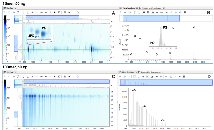 Biologics Explorer software provides excellent visualization tools for rapid assessment of data quality and impurity level. Figure 5 shows the ion maps and mass spectra from IP RPLC-MS analyses of 18mer and 100mer (50 ng) using the ZenoTOF 8600 system. The ion map offers a 2-dimensional view of the raw data of these 2 oligonucleotides (Figures 5A and 5C). The mass spectrum at specific RT (Figures 5B and 5D) or extracted ion chromatogram (XIC) of a specific m/z (not shown) can be conveniently viewed side-by-side with the ion map. A closer view of the 18mer data revealed the presence of the full-length product (PS) and its PO species, which were partially separated from the PS (insets in Figures 5A and 5B).