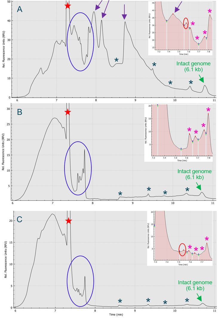 Figure 9Effects of benzonase and DNase I treatments on genome analysis profile of LV-CAG-GFP samples.  Samples were treated with control buffer (panel A) or  benzonase (panel B) or DNase I (panel C) prior to RNA extraction. Extracted RNA was eluted with nuclease-free water and analyzed on the BioPhase 8800 system. Peaks labeled with red, blue and pink stars were detected in all three panels. Peaks labeled with purple arrows were only detected in the control. Peak marked with red circle was present in control and DNase I treated samples, not in benzonase treated sample.