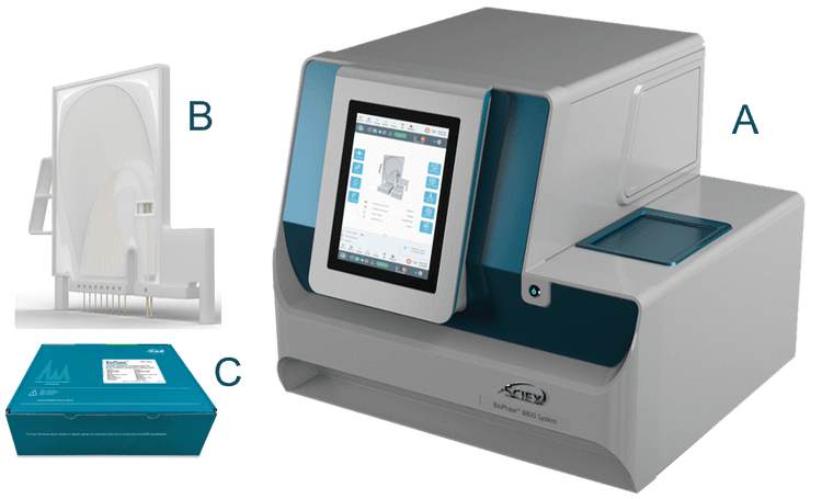 Figure 2. The BioPhase 8800 system (A), pre-assembled multi-capillary cartridge (B) and plate kit (C).