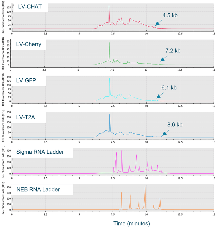 Analysis of LVs with different RNA genome sizes: RNA was extracted from 4 LVs: LV-ChAT-GFP, LV-CAG-Cre-mCherry, LV-CAG-GFP and LV-EF1a-GFP-T2A-fluc-Puro as described in the methods section. After elution with 40 μL nuclease free water, 20 μL of it was mixed with 30 μL SLS, heated at 70°C for 2 minutes. After a quick chill on ice, samples were loaded on the BioPhase 8800 system for CE-LIF analysis. Results are shown Figure 1. The pink trace is the Sigma RNA size standards with sizes marked in dark blue font while the orange trace shows the NEB RNA ladder. Electropherograms obtained with LV-ChAT-GFP, LV-CAG-Cre-mCherry, LV-CAG-GFP and LV-EF1a-GFP-T2A-fluc-Puro are shown in red, green, turquois and blue traces with intact RNA genome sizes of 4.5 kb, 7.2 kb, 6.1 kb and 8.6 kb, respectively. In addition to peaks corresponding to expected intact genome sizes, smaller sized species were also detected for each LV sample. These might be a combination of impurities outside of the LV particles, partial RNA genomes and smaller RNA fragments inside the LV particles.