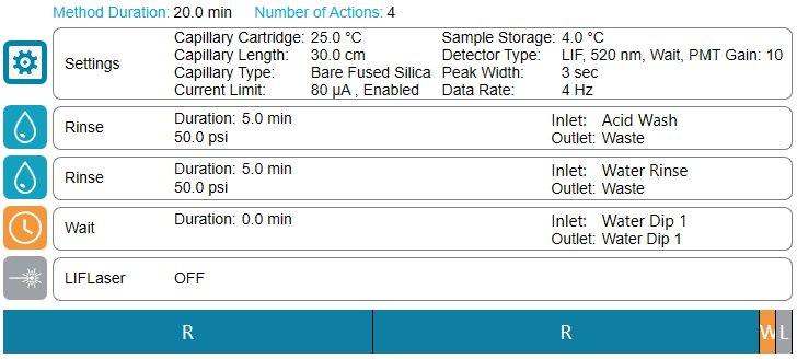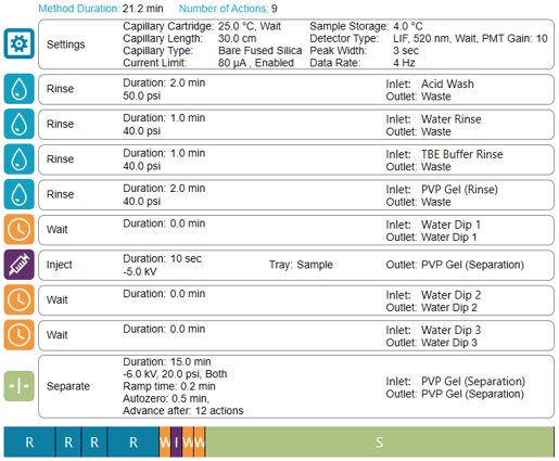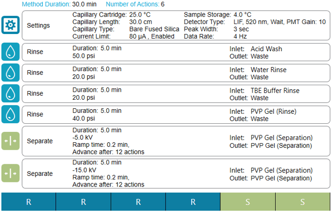 Method and sequence creation:  Methods were created using the intuitive tile-based drag-and-drop interface in the “Method Editor” module of the BioPhase Software where desired buffers, reagents, and specific actions like “rinse” and “inject’ steps were selected to assemble into a method. Similarly, run sequences were created in the “Sequence Editor” module of the BioPhase Software in which desired methods were selected and applied to each sample column, as described in the BioPhase 8800 System Operator Guide.8 Amounts of reagents needed were calculated by the BioPhase Software based on methods and number of sample injections in the sequence. Once a sequence was created, sample plate layout and reagent plate layout were generated by the BioPhase Software. Settings for cartridge conditioning, sample separation and shutdown methods are provided in Figures 3, 4 and 5, respectively.