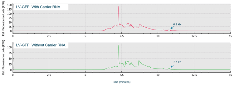 Importance of using carrier RNA during RNA extraction: In order to understand the impact of carrier RNA on the yield of RNA extraction, two vials of LV-CAG-GFP samples at 26 μL were pooled, mixed by gentle inverting and transferred to two Eppendorf tubes at 25 μL each. Both were subjected to the same RNA extraction process with the QIAamp Viral RNA Mini Kit, except one with 10 ng/mL carrier RNA in the lysis buffer, and the other one without carrier RNA. After elution with 40 μL of nuclease free water, 20 μL of it was mixed with 30 μL SLS, heated at 70°C for 2 minutes. After a quick chill on ice, samples were loaded on the BioPhase 8800 system for CE-LIF analysis. Results are shown in Figure 8. The red trace was obtained with RNA extracted with carrier RNA while the green trace was obtained without carrier RNA. Although the peak profiles were identical in the two traces, the scale in the green trace was smaller, indicating that lower RNA yield was obtained without carrier RNA. Therefore, carrier RNA should be included in the lysis buffer for RNA extraction for improved yield.