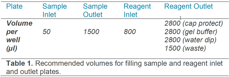 Table 1. Recommended volumes for filling sample and reagent inlet and outlet plates.