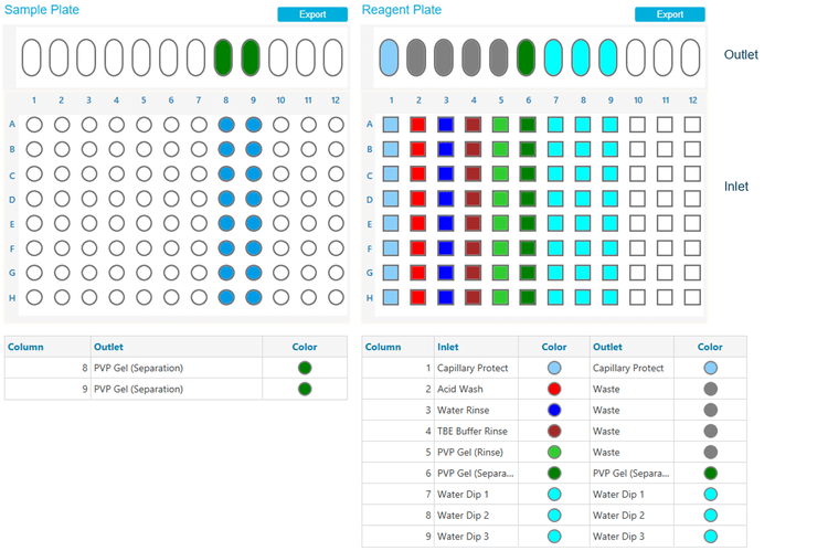 Figure 6.   An example of sample plate (left panel) and reagent plate (right panel) layouts for running 16 samples in two columns. Wells selected were indicated by colored circles on sample plate, ovals on outlet plates and squares on reagent inlet plate. Tables below the plate layouts provided legends for color codes used in plate layouts.