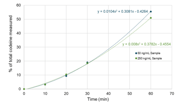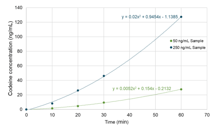 The data collected revealed an exponential rate of enzymatic conversion from codeine-6-glucuronide to codeine. The rate was higher for the 250 ng/mL sample than the 50 ng/mL sample. Figure 6 shows the proportionality between the 2 different concentrations, which differ by a factor of 5 (50 ng/mL vs. 250 ng/mL).