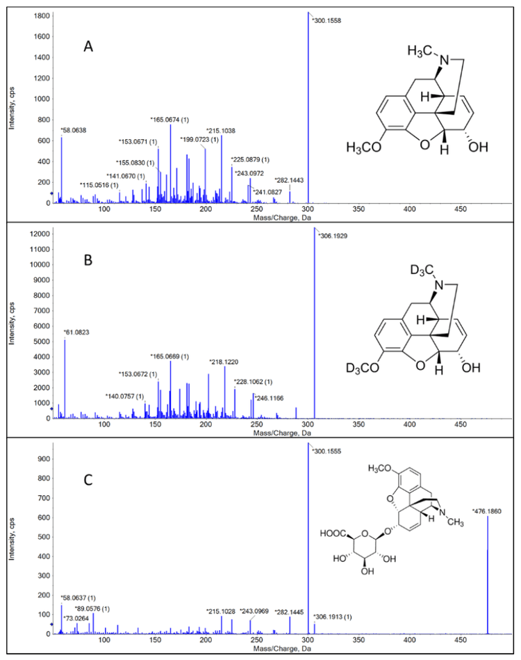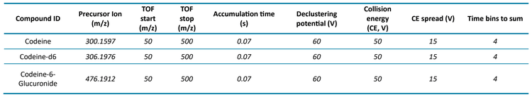 Mass spectrometry:  A Zeno MRMHR method was utilized to analyze codeine, codeine-d6 and codeine-6-glucuronide. Precursor ions with m/z 300.1597, 306.1976 and 476.1912 were analyzed for codeine, codeine-d6, and codeine-6-glucuronide, respectively. A TOF MS/MS scan was performed for product ions of the precursor ions between 100–500 m/z. Two product ions were chosen to quantitatively measure each of the above ions (Tables 1-4).