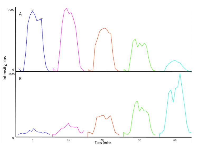 Figure 1. Specific detection of substrate and product at different time intervals. Wide peak ejections are shown for A) codeine-6-glucuronide and B) the hydrolysis product, codeine. Ejections are shown at 5 different timepoints spanning 1 hour during the kinetic hydrolysis study. Peaks from both compounds were offset to show the effects of time and intensity.