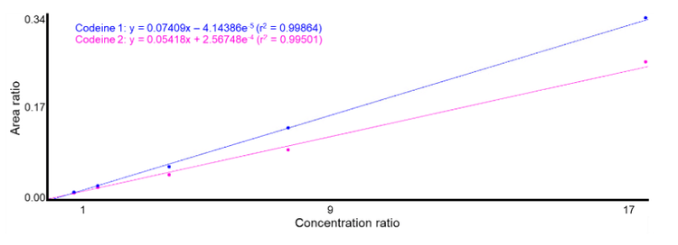 Figure 4. Calibration curves for codeine 1 (blue trace) and codeine 2 (pink trace).