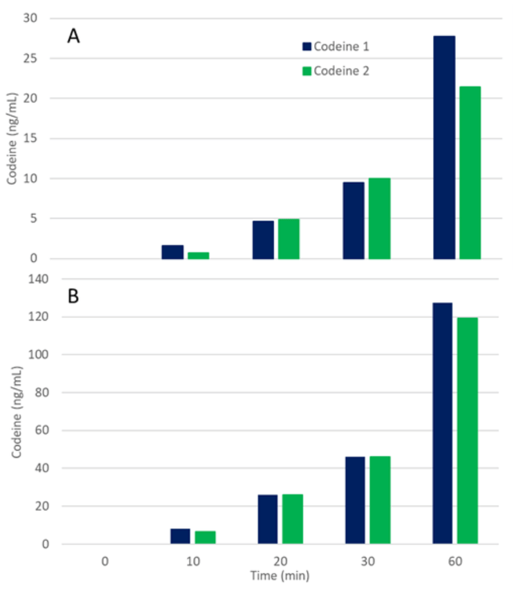 Figure 5. Concentrations of free codeine over time. Measurements were made at 5 different time points within 1 hour for a 50 ng/mL sample (A) and a 250 ng/mL sample (B) of codeine-6-glucuronide.