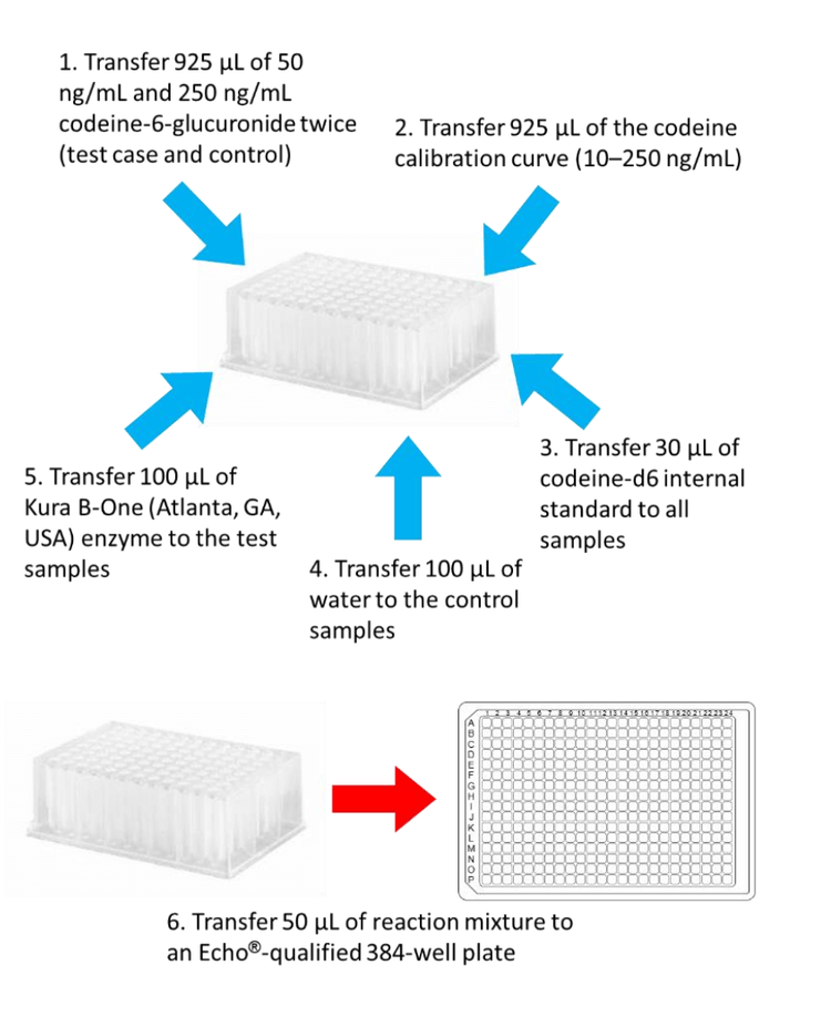 Codeine is a naturally occurring opiate that can be consumed orally to treat acute pain via the conversion of codeine to morphine in the liver.1 The codeine that is not converted to morphine undergoes glucuronidation or N-demethylation.1 Codeine-6-glucuronide, a product of codeine glucuronidation, is difficult to convert to codeine, even using beta-glucuronidase enzymes.2,3 In this study, we used the Biomek i7 automated liquid handler from Beckman Coulter Life Sciences and the Echo® MS+ system with ZenoTOF 7600 system to monitor the conversion of codeine-6-glucuronide to codeine. The conversion of a 50 ng/mL and of a 250 ng/mL sample of codeine-6- glucuronide was monitored at 5 time points over 1 hour while incubating at 55°C (Figure 1).