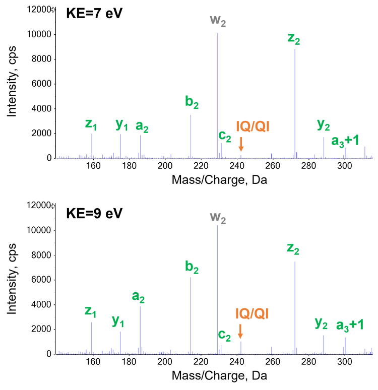 Figure 2 displays EAD spectra of the triply charged leptin (Ile) at electron KE = 1 eV and 7 eV. An electron KE = 1 eV (Figure 2A) produced a high-quality EAD spectrum, dominated by c/z-type fragments. This result is consistent with typical low-energy ExD experiments and yielded complete sequence coverage of this peptide. A higher electron KE of 7 eV (Figure 2B) leveraged hot ECD1, a mechanism that led to the formation of additional fragment ions (a/b-type) for increased confidence in identification and secondary fragmentation of z ions, needed for differentiation between isomers, as will be described more in detail in the following section.