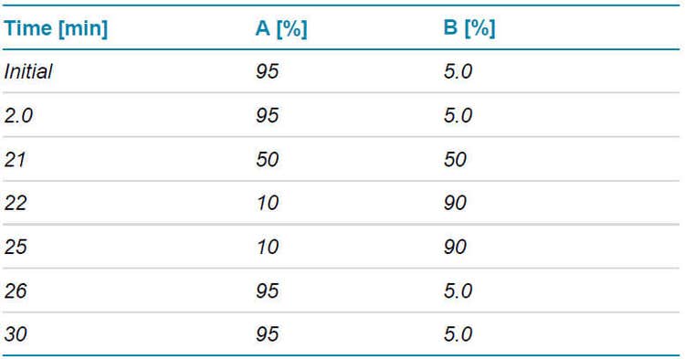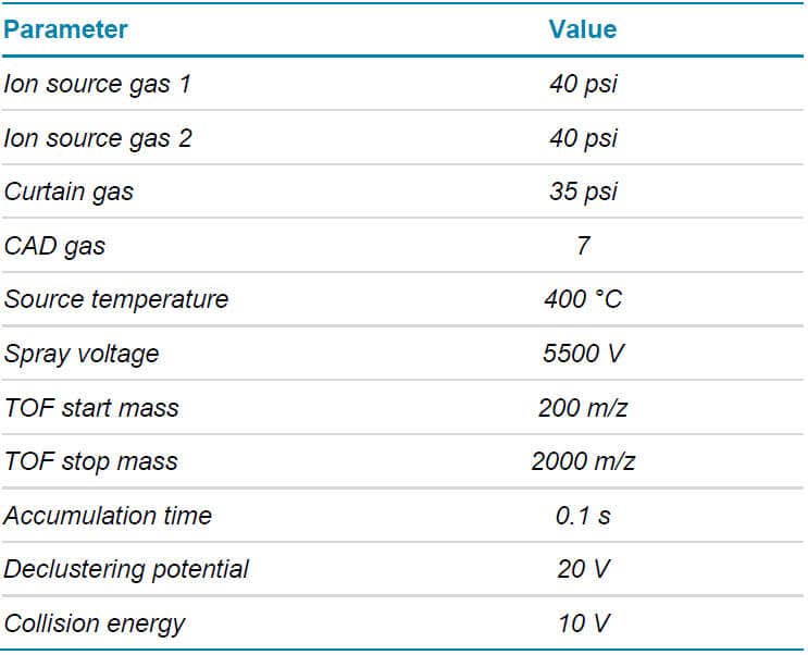 Chromatography: Peptides were separated using an ACQUITY CSH C18 column (2.1 × 150 mm, 1.7 µm, 130 Å, Waters Corp), which was kept at 60 °C in the column oven of an ExionLC system (SCIEX). Table 1 shows the LC gradient used for separation of peptide isomers at a flow rate of 0.25 mL/min with mobile phases A and B consisting of 0.1% formic acid (FA) in water and 0.1% FA in acetonitrile, respectively. The separation of peptides derived from NISTmAb and etanercept were carried out using a 60-minute gradient described previously.2