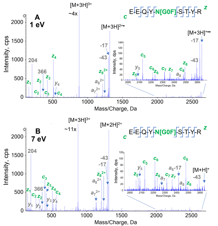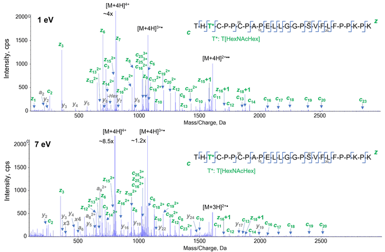 Similar to the observation made for the unmodified peptide (Figure 2), an electron KE = 7 eV produced more fragment ions that aided in the identification of the glycopeptides, while still providing confident localization information of the glycosylation. It should be noted that only 1 of the 3 potential sites (2 T and 1 S) in the analyzed O-linked glycopeptide was found to be occupied. These results demonstrate that the EAD platform method using electron KE = 7 eV is powerful for the identification of N- and O-linked glycopeptides, due to extensive peptide backbone fragmentation, and enables accurate localization of glycosylations within peptides with multiple potential glycosylation sites.