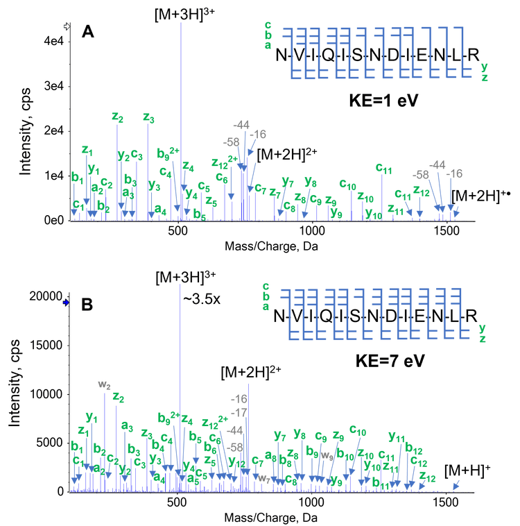 Interestingly, increasing electron KE to 10 eV yielded the optimal outcome for singly charged peptides in terms of the number and intensity of the sequence ions detected (Figure 8B). However, further increase of electron KE to >10 eV resulted in excessive internal and secondary fragmentation, without providing any information gain such as additional sequence information (data not shown).