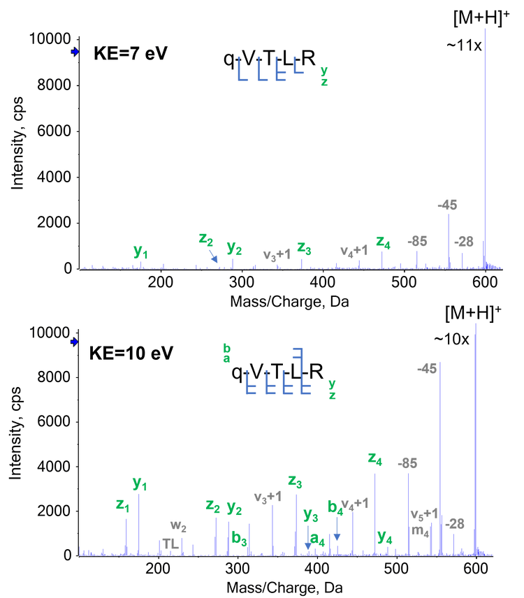 The analysis of singly charged peptides has been a long-standing challenge for traditional ExD approaches and has limited their adoption as a general characterization tool, compared to CID. In this work, the ability of EAD of singly charged peptides was explored. Low electron KEs of 1-5 eV were not sufficient to produce fragment ions for singly charged peptides (data not shown). By comparison, the EAD platform method generated predominantly y/z-type ions for complete sequence coverage of the singly charged qVTLR (q = pyroglutamic acid) from the N-terminus of NISTmAb heavy chain (Figure 8A). Similar results were obtained for other singly charged peptides (for example, SFNR and SLSLSPG) in the NISTmAb digest (data not shown).