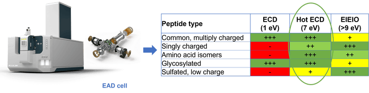 - Confident peptide identification, differentiation between isomers, accurate localization of glycosylations and the characterization of singly charged peptides with EAD enable an unprecedented level of information, not achievable with CID or traditional ExD techniques in a single injection