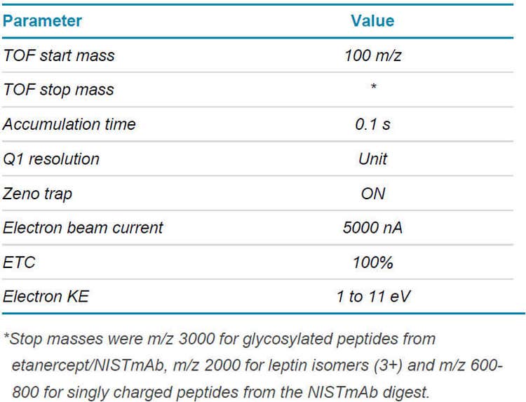 The power of a generic platform method using alternative fragmentation with EAD at 7 eV for confident peptide mapping, differentiation of isomers and accurate localization of glycosylation was highlighted in previous technical notes.2-6 Here, the effect of electron KE, which is a key parameter for EAD, on fragmentation of isomeric, singly to multiply charged, and glycosylated peptides was studied in detail. The results highlight the benefits of using an electron KE = 7 eV as a generic setting for effective, yet comprehensive bottom-up analysis of protein therapeutics.