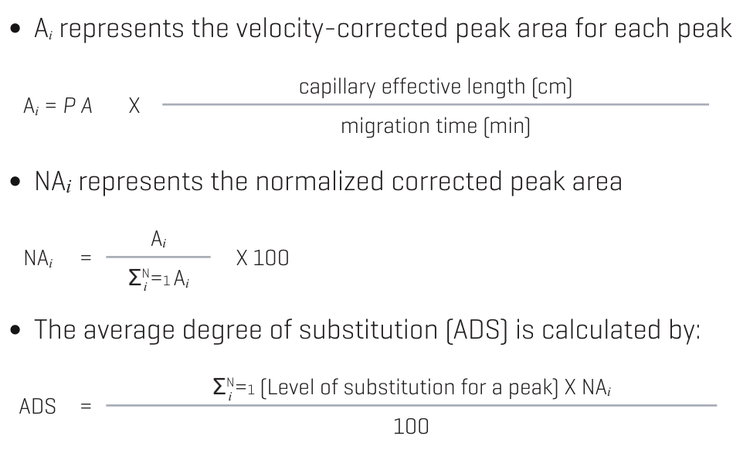 - 3 different pH values of background electrolyte (BGE) were investigated to analyze the ADS of sulfobutyl-β-cyclodextrin standard solution according to USP criteria for Normalized corrected peak area and degree of substitution (Figure 1).